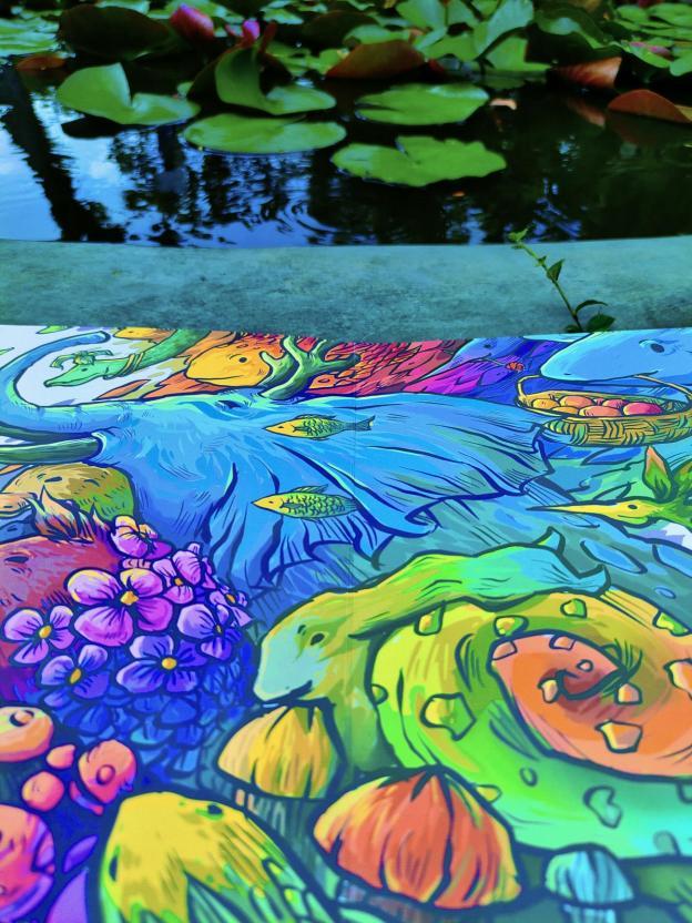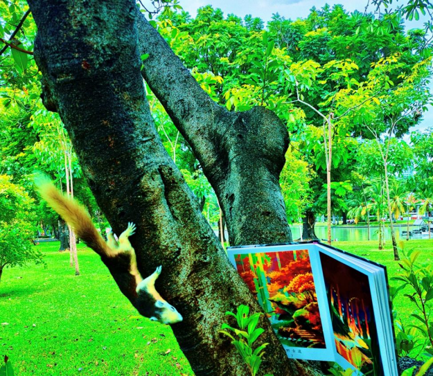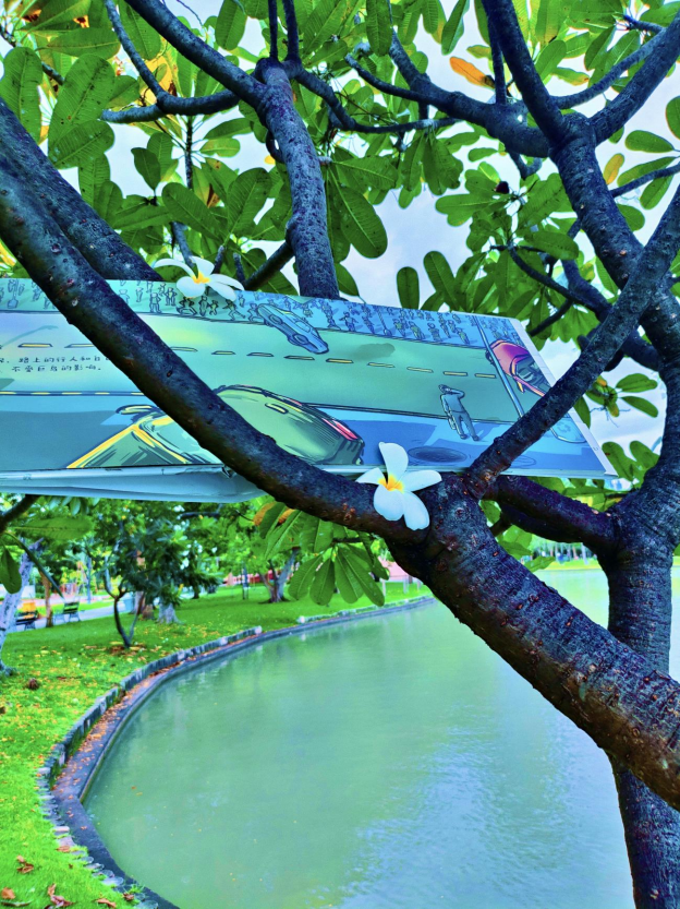 Meanwhile, Professor Huang Xiao of the International College of The Arts, Krirk University—also the exhibition’s curator—has infused these illustrations with a heartbeat through poetry. Not only has she composed mist-like verses for each image, she has, with the precision of an archaeologist and the intuition of a poet, discovered several “dream entrances” within Chatuchak Park: the aerial root curtain of a century-old banyan tree, the reflective threshold of a lotus pond, the shadow theatre framed by moss-covered stones.