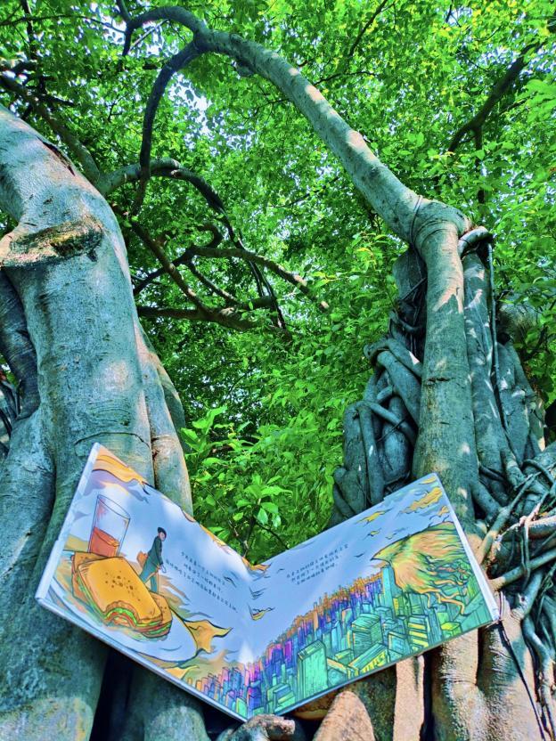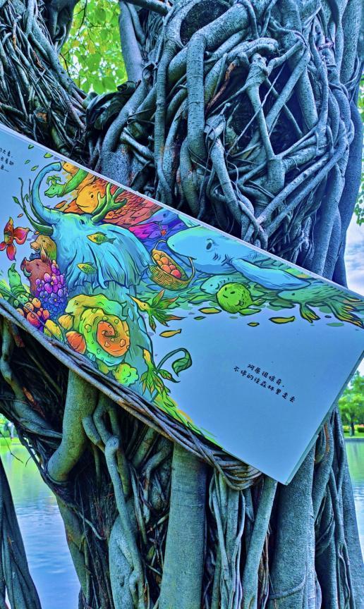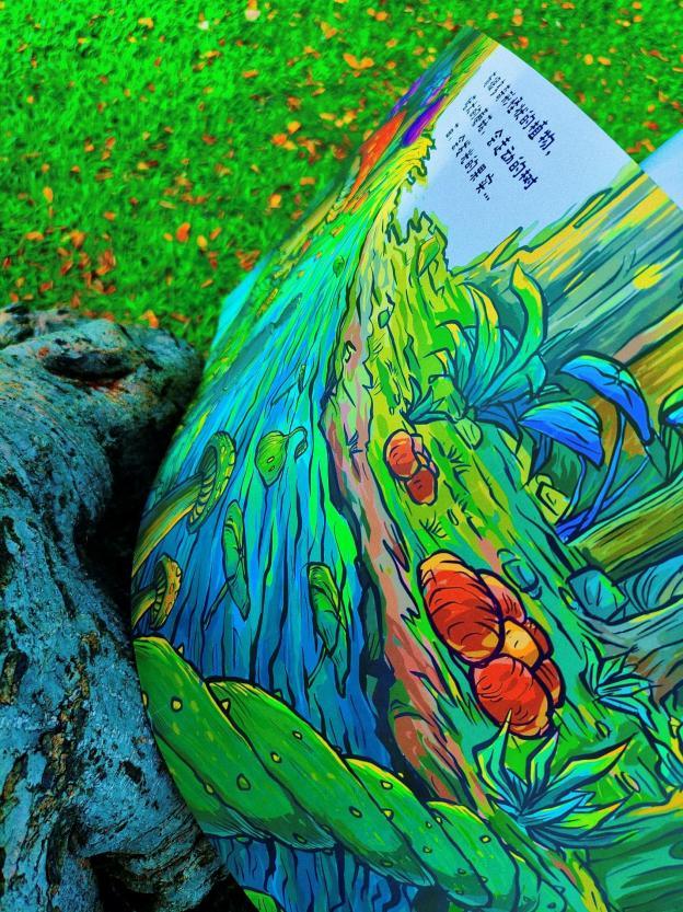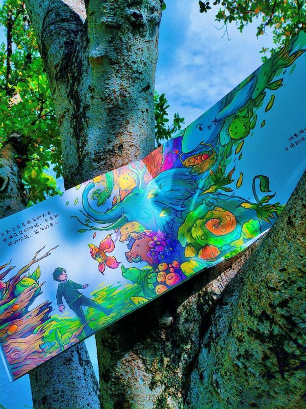 Once the picture books areplaced within these natural frames, the magic begins: waterfalls in the illustrations connect with real dewdrops to form chains of water; glowing moss on the pages echoes the forest floor’s fungal threads in twilight.