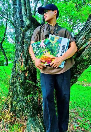 The artist Luo Zihang holding his two picture books; The curator Huang Xiao