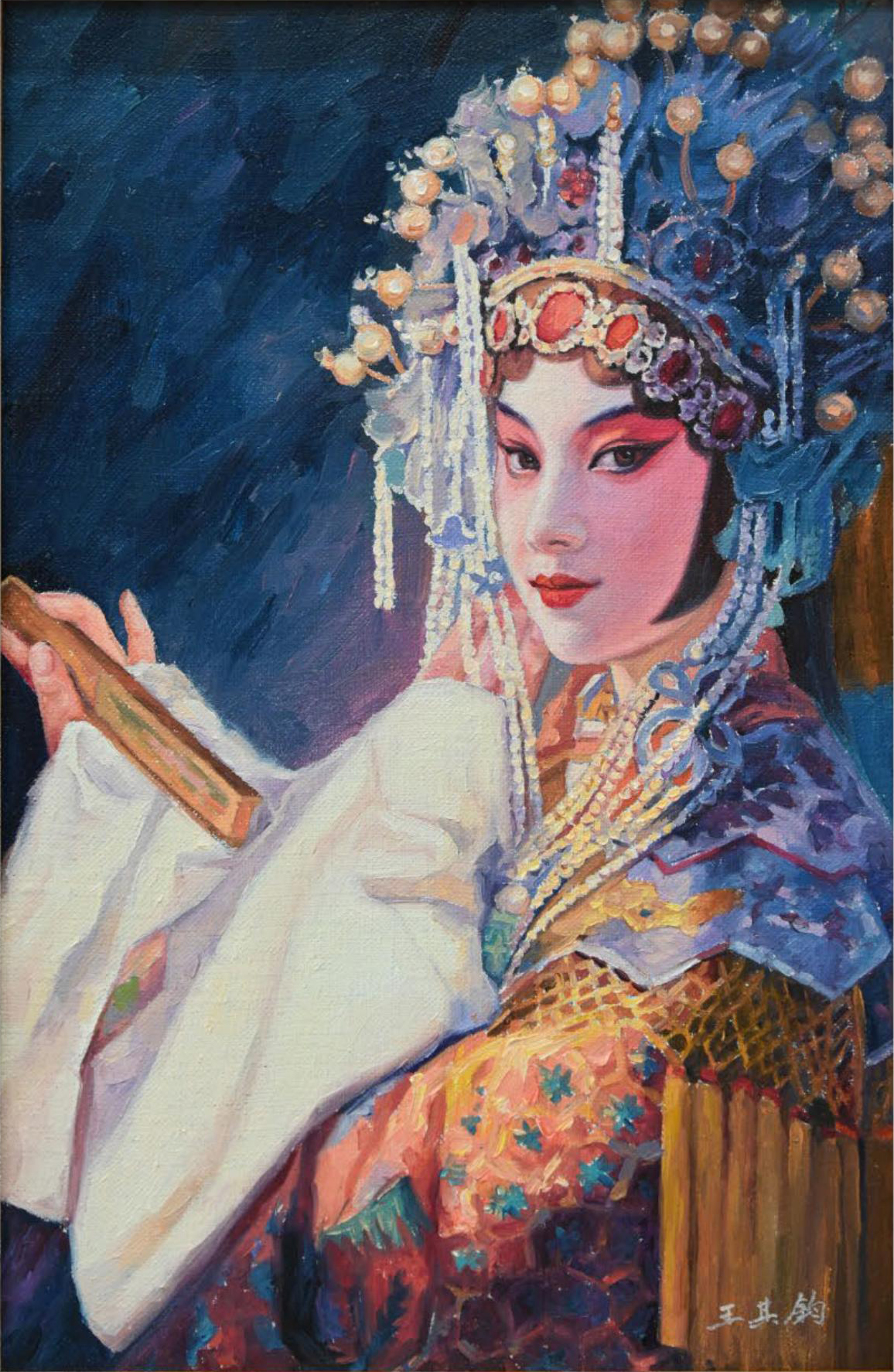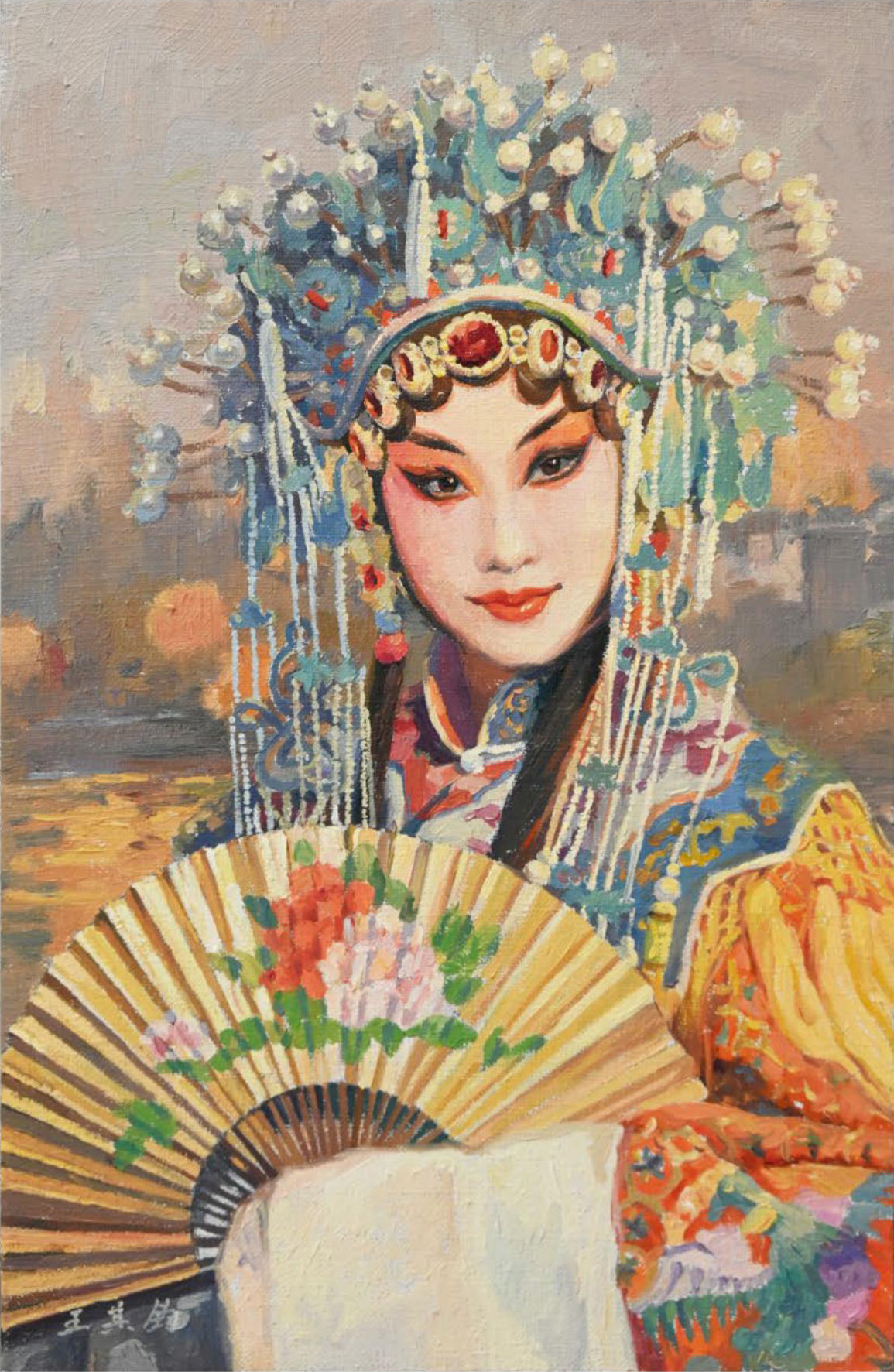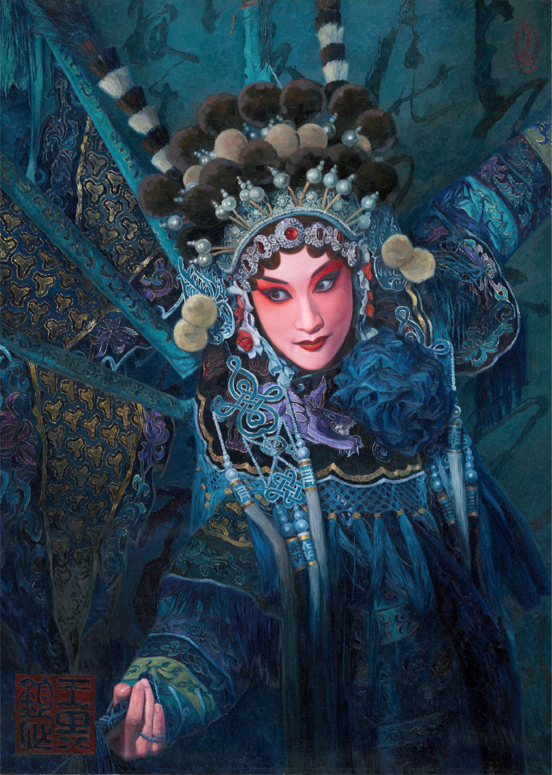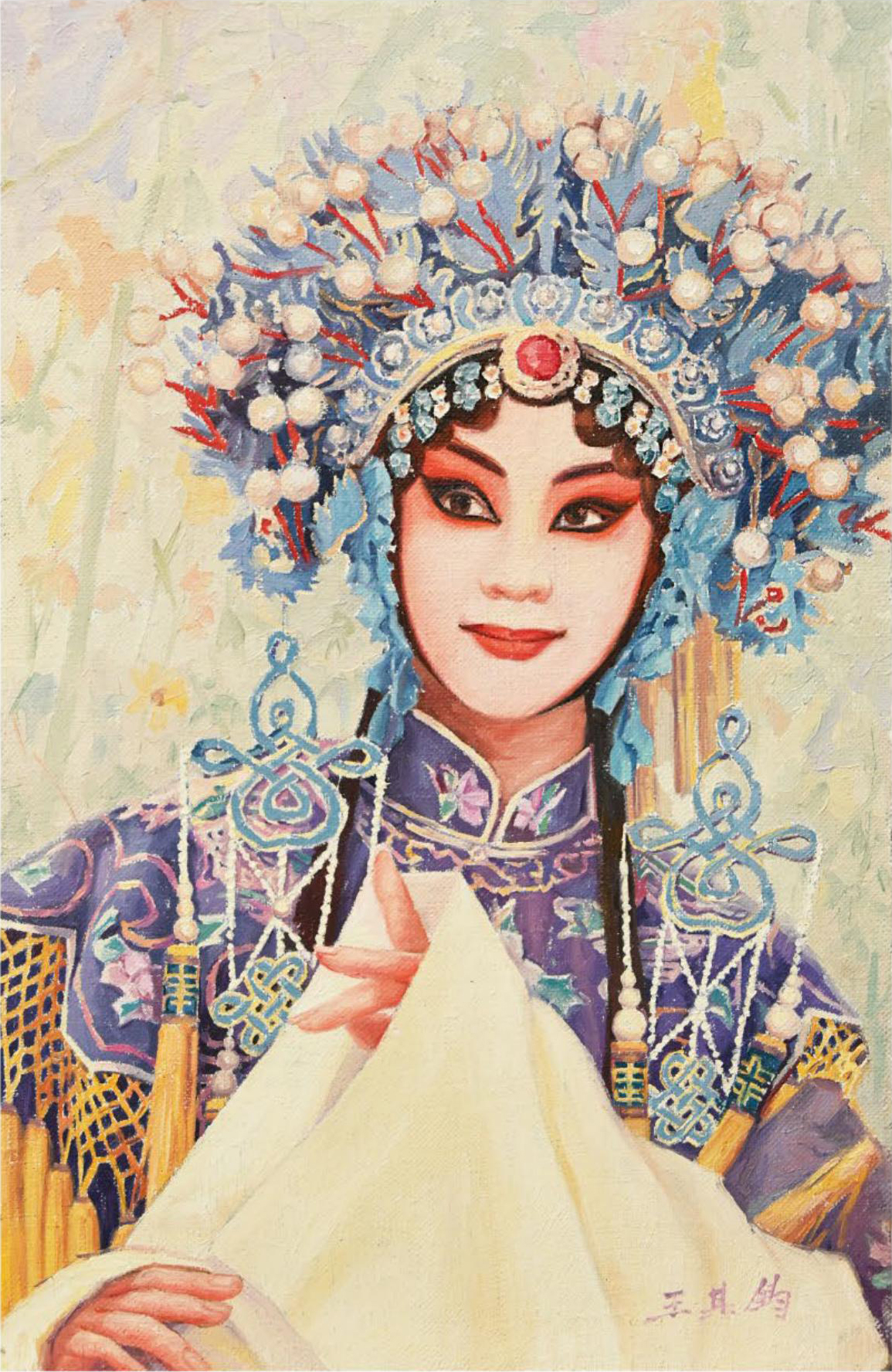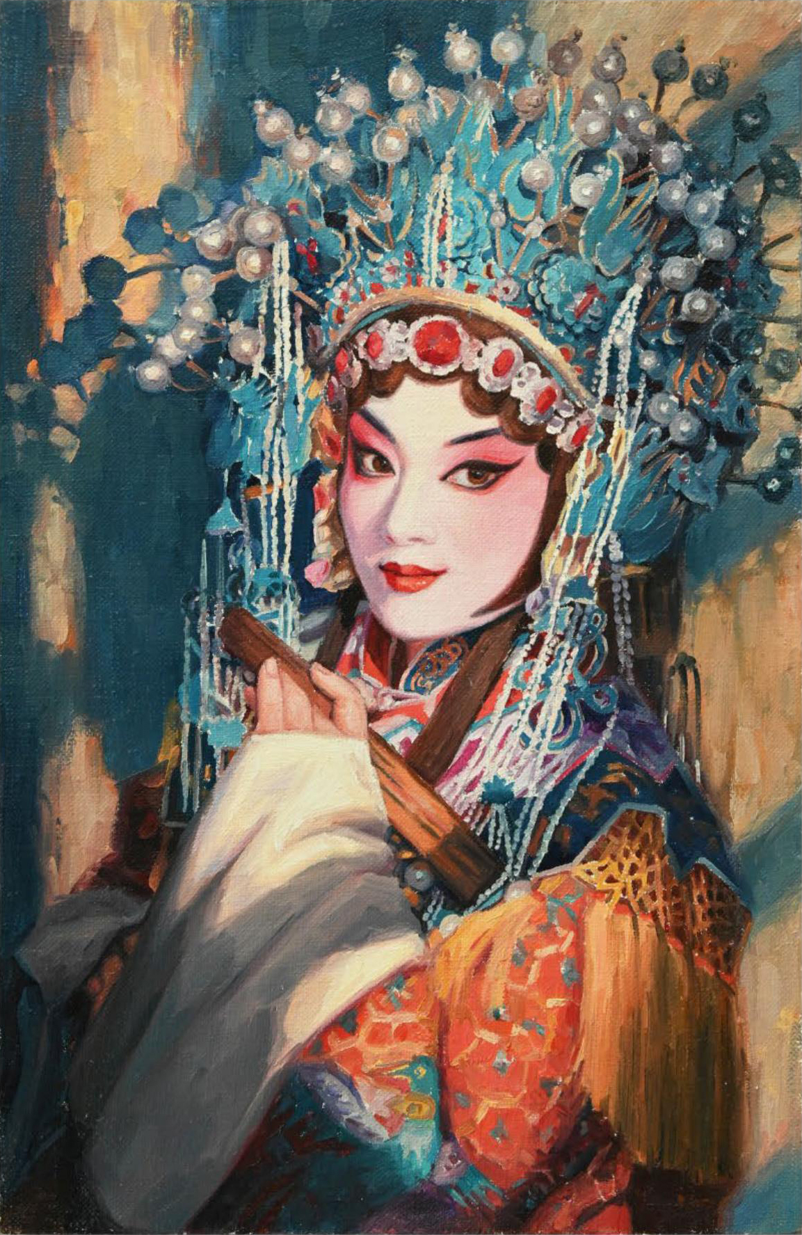 The graceful figure of a Peking Opera dan is immortalized in blended oil paints. Her magnificent opera costume takes center stage.