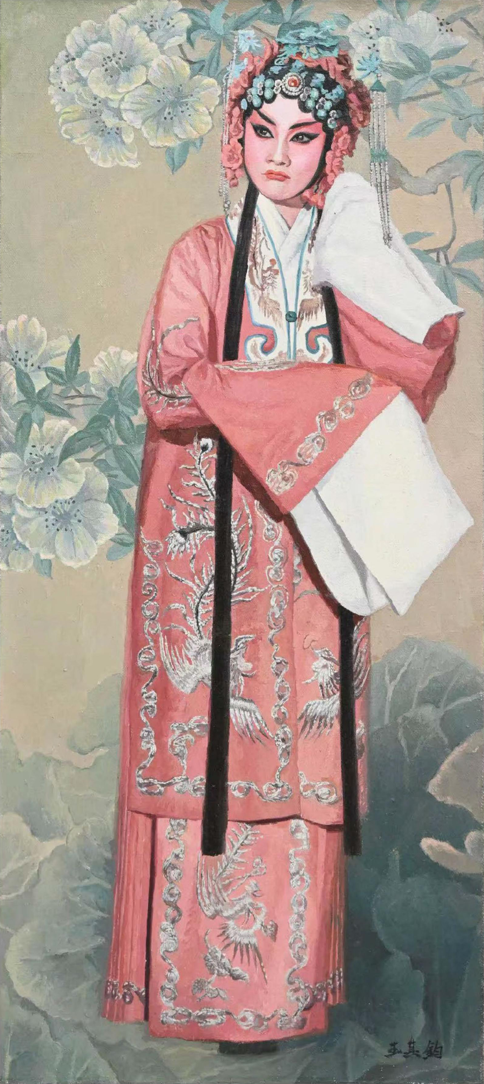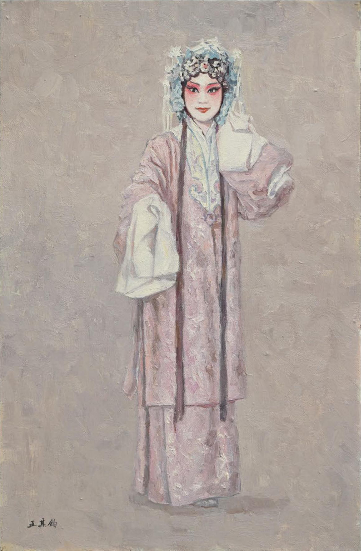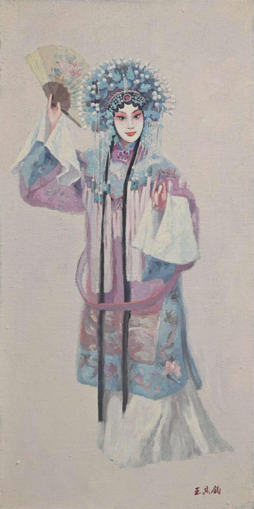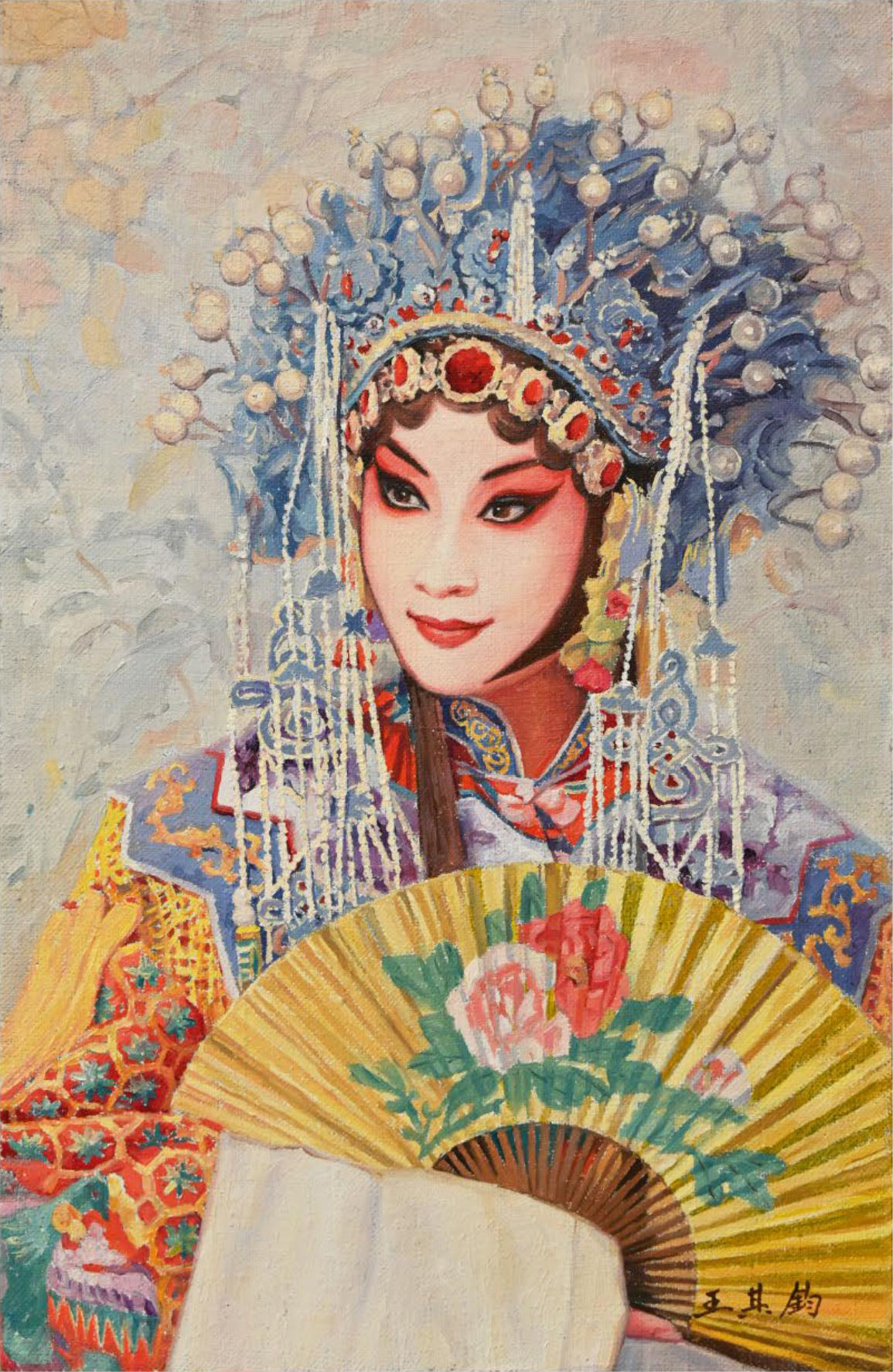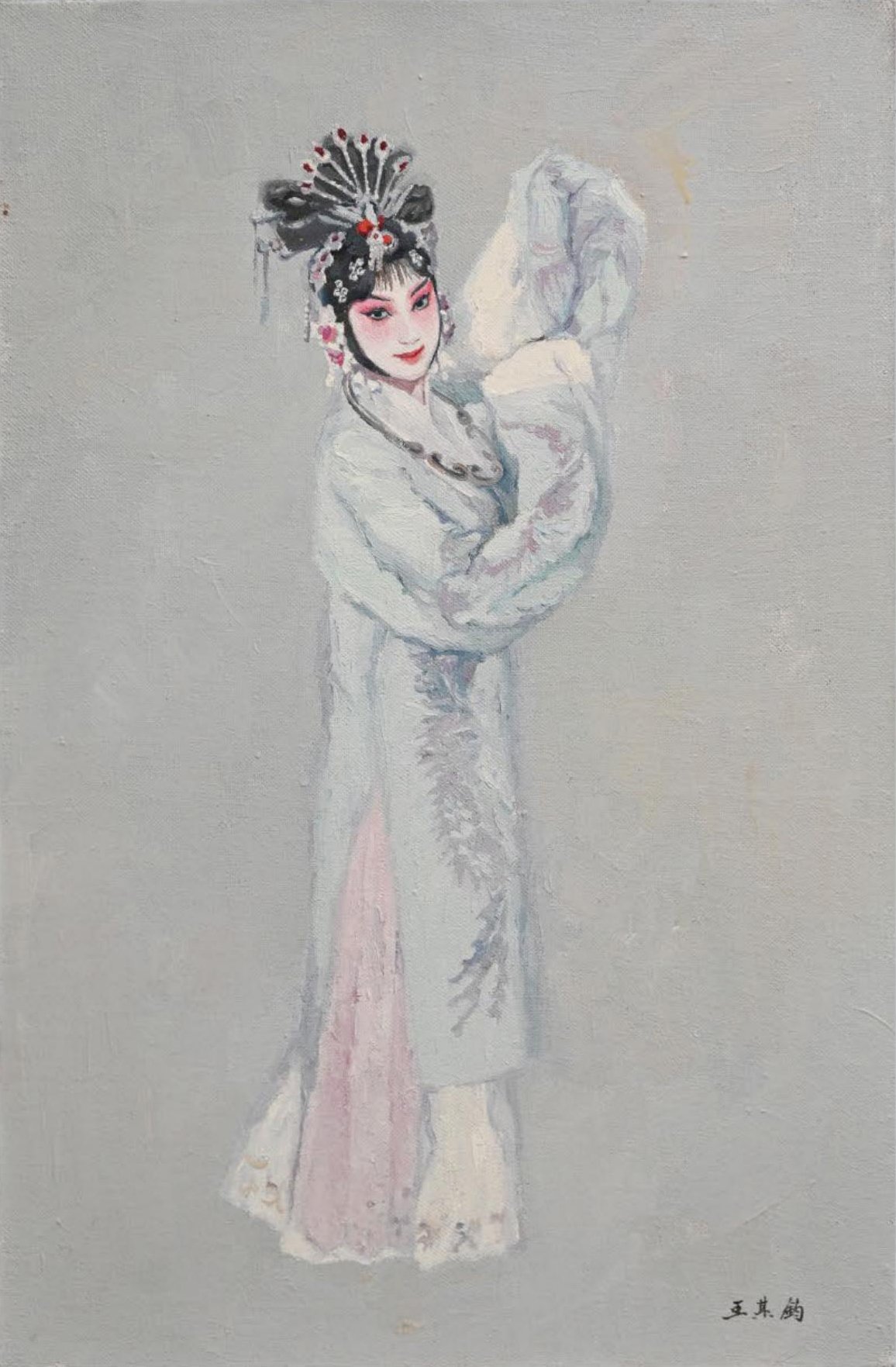 The graceful figure of a Peking Opera dan is immortalized in blended oil paints. Her magnificent opera costume takes center stage.