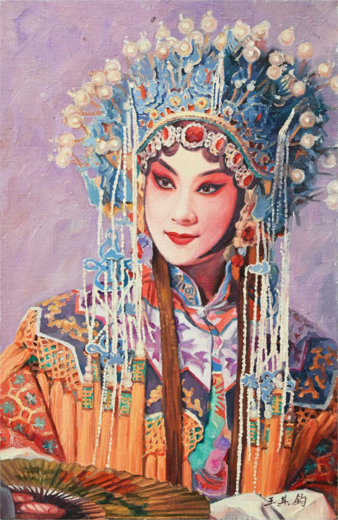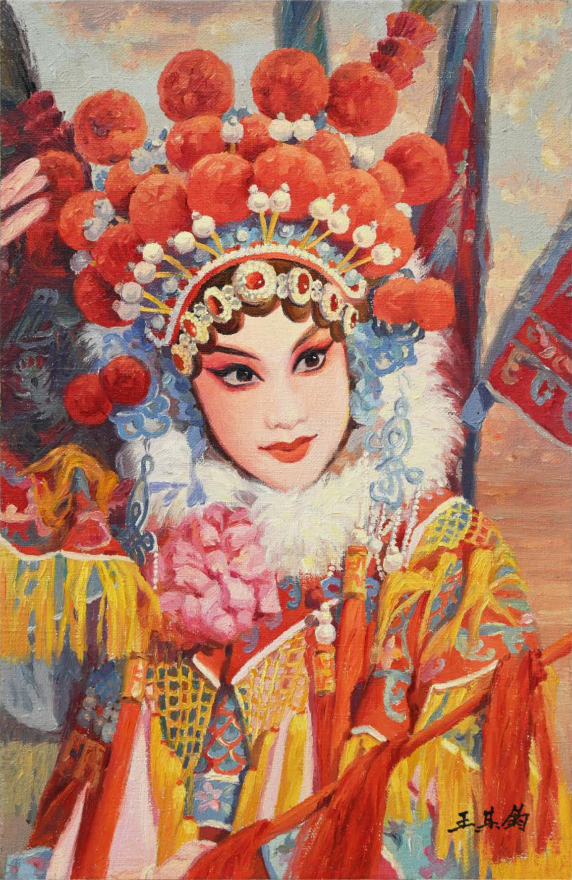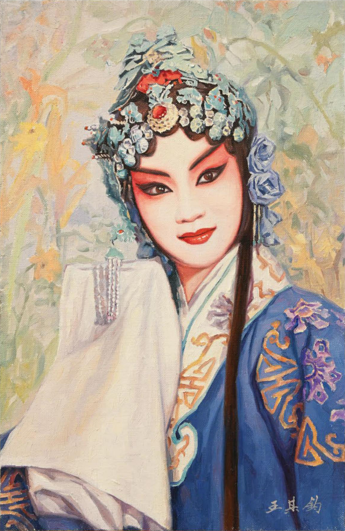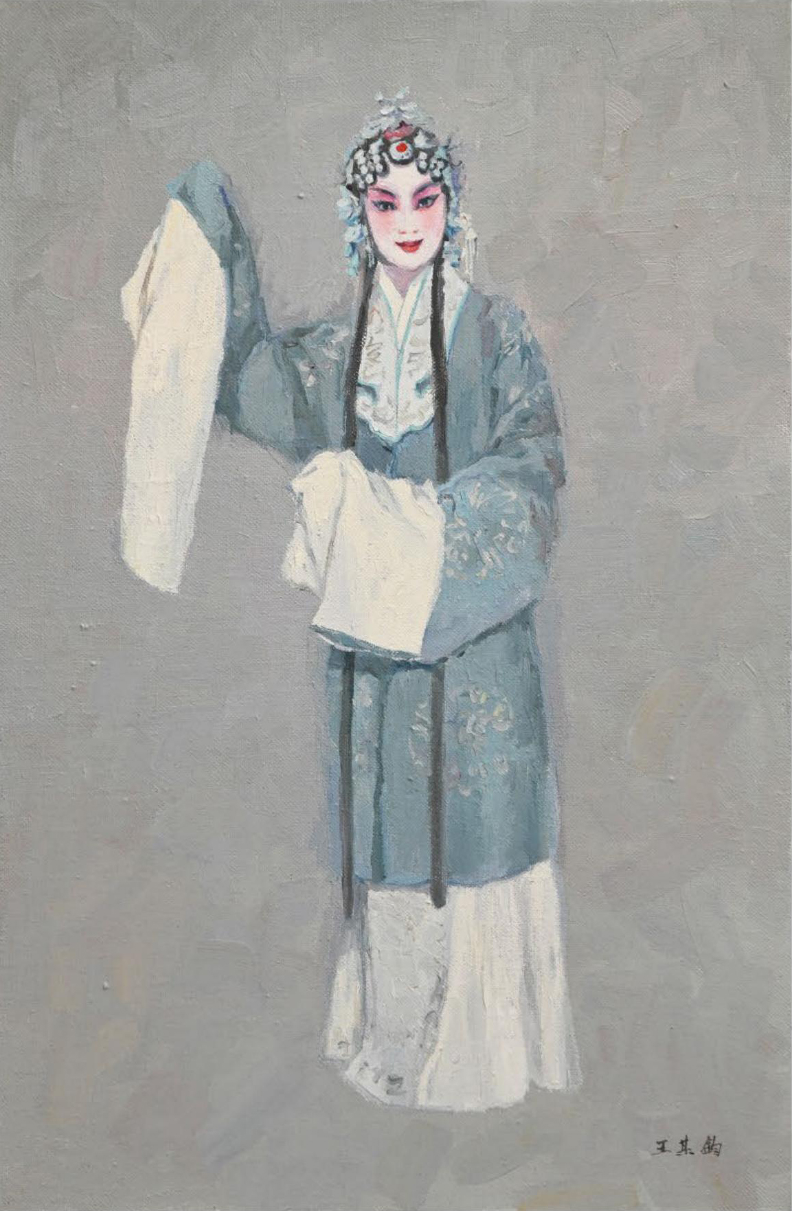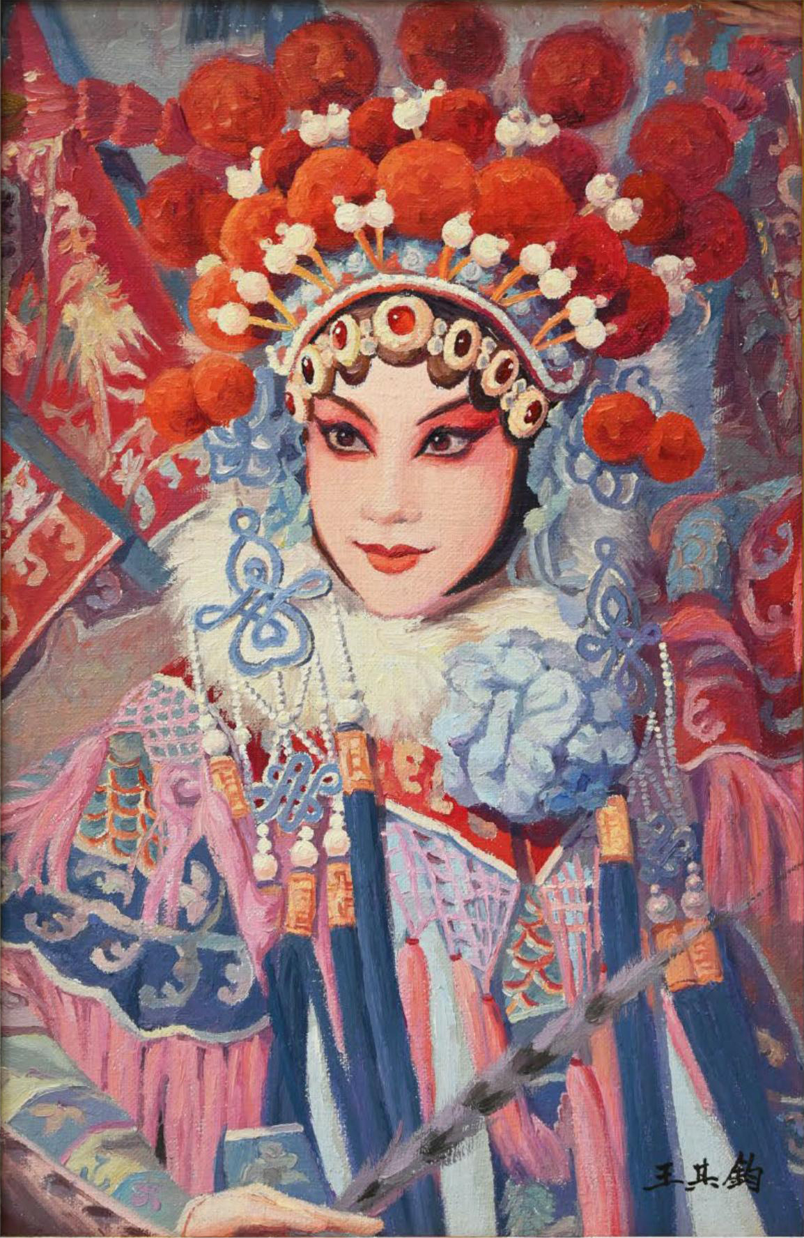 The graceful figure of a Peking Opera dan is immortalized in blended oil paints. Her magnificent opera costume takes center stage.