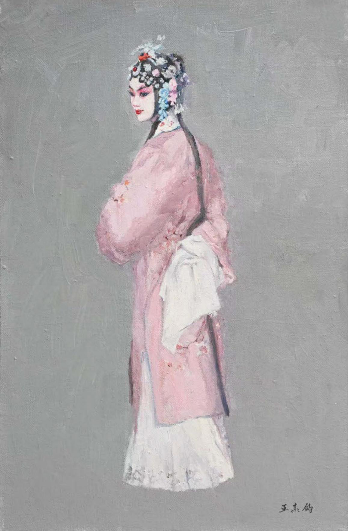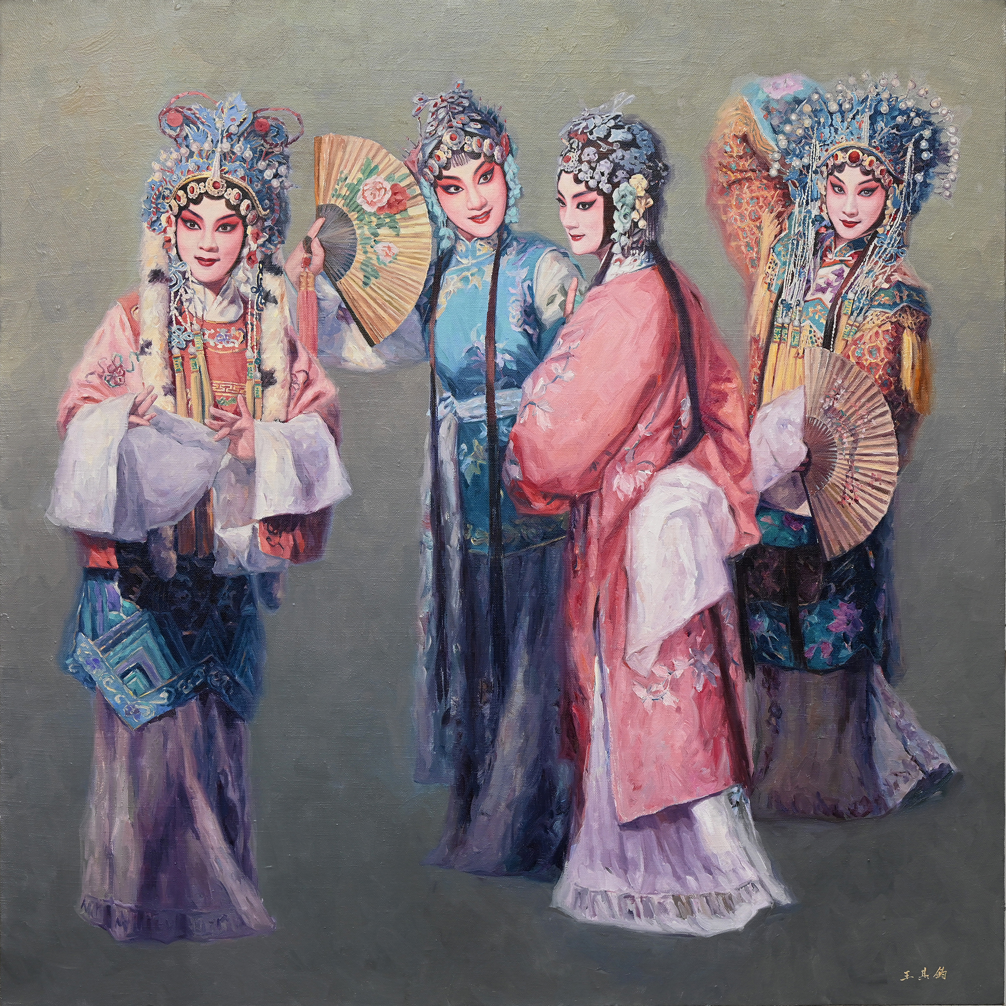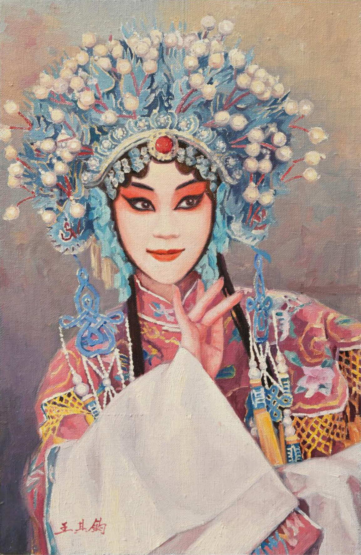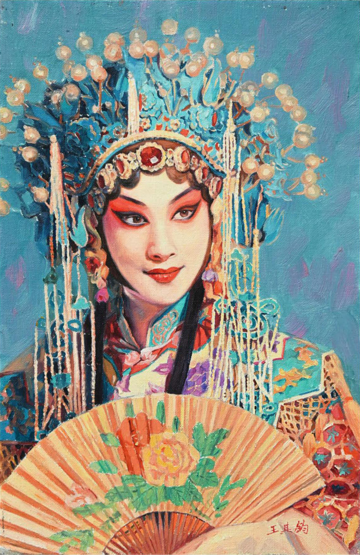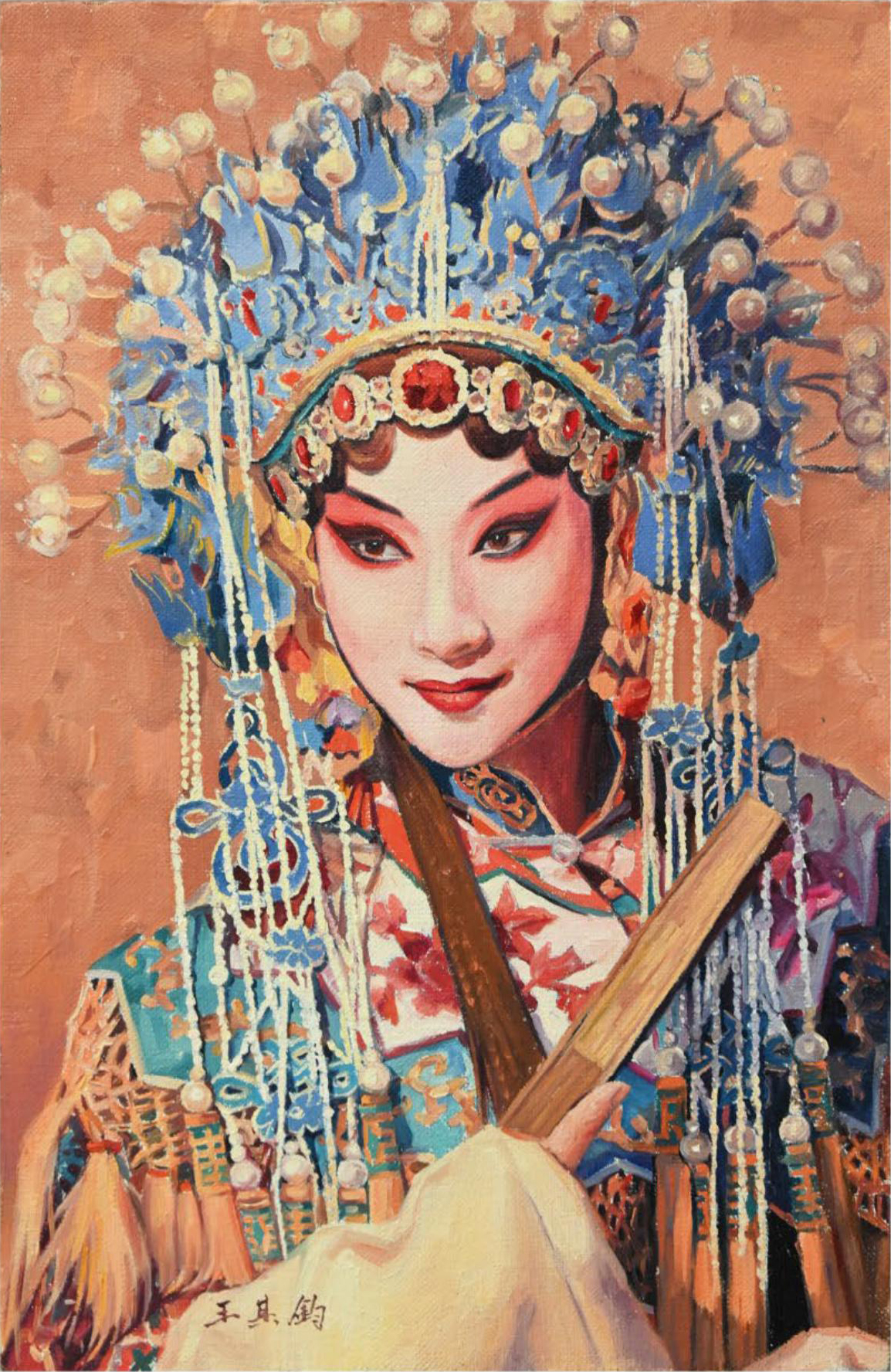 The graceful figure of a Peking Opera dan is immortalized in blended oil paints. Her magnificent opera costume takes center stage.