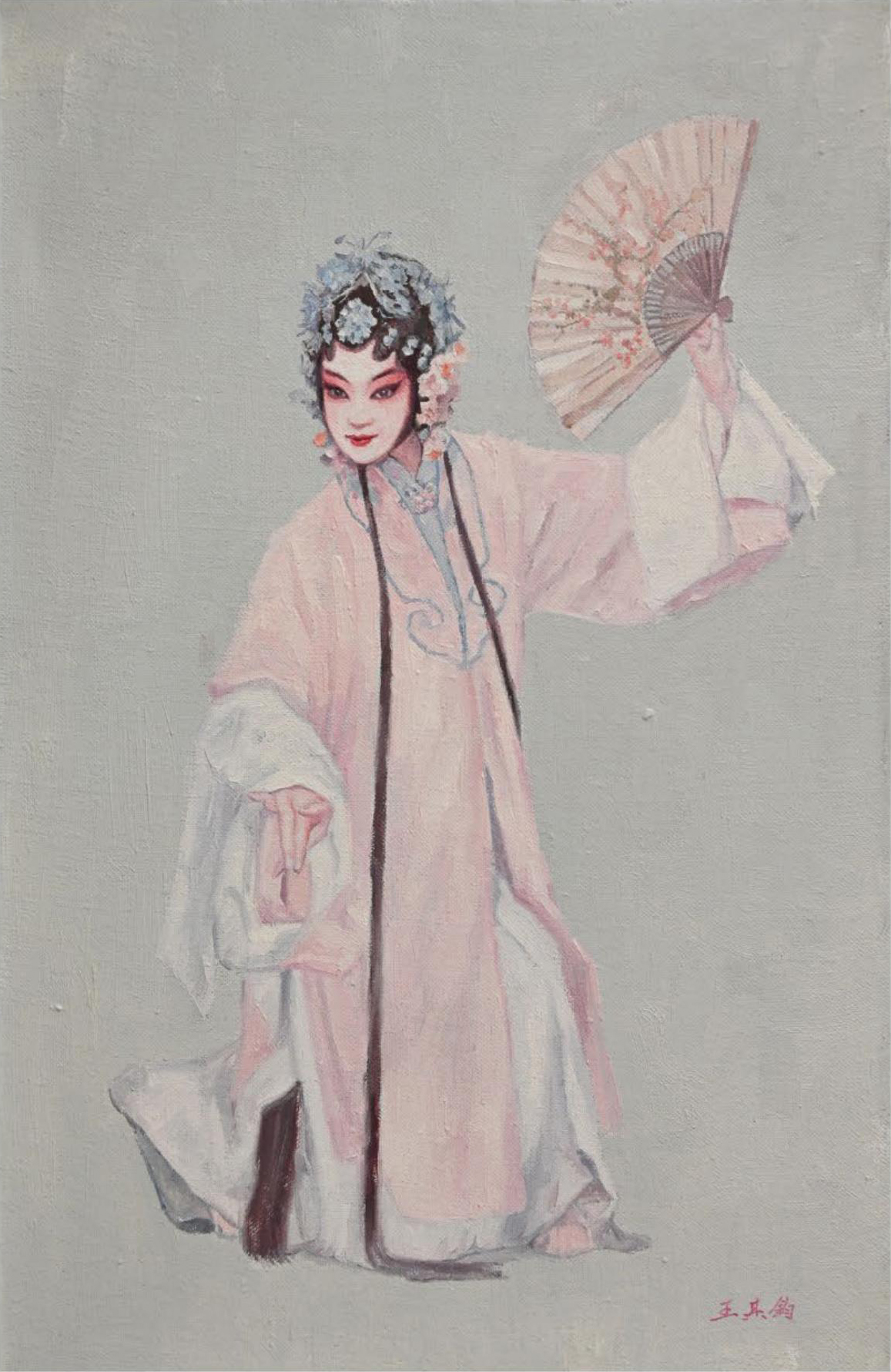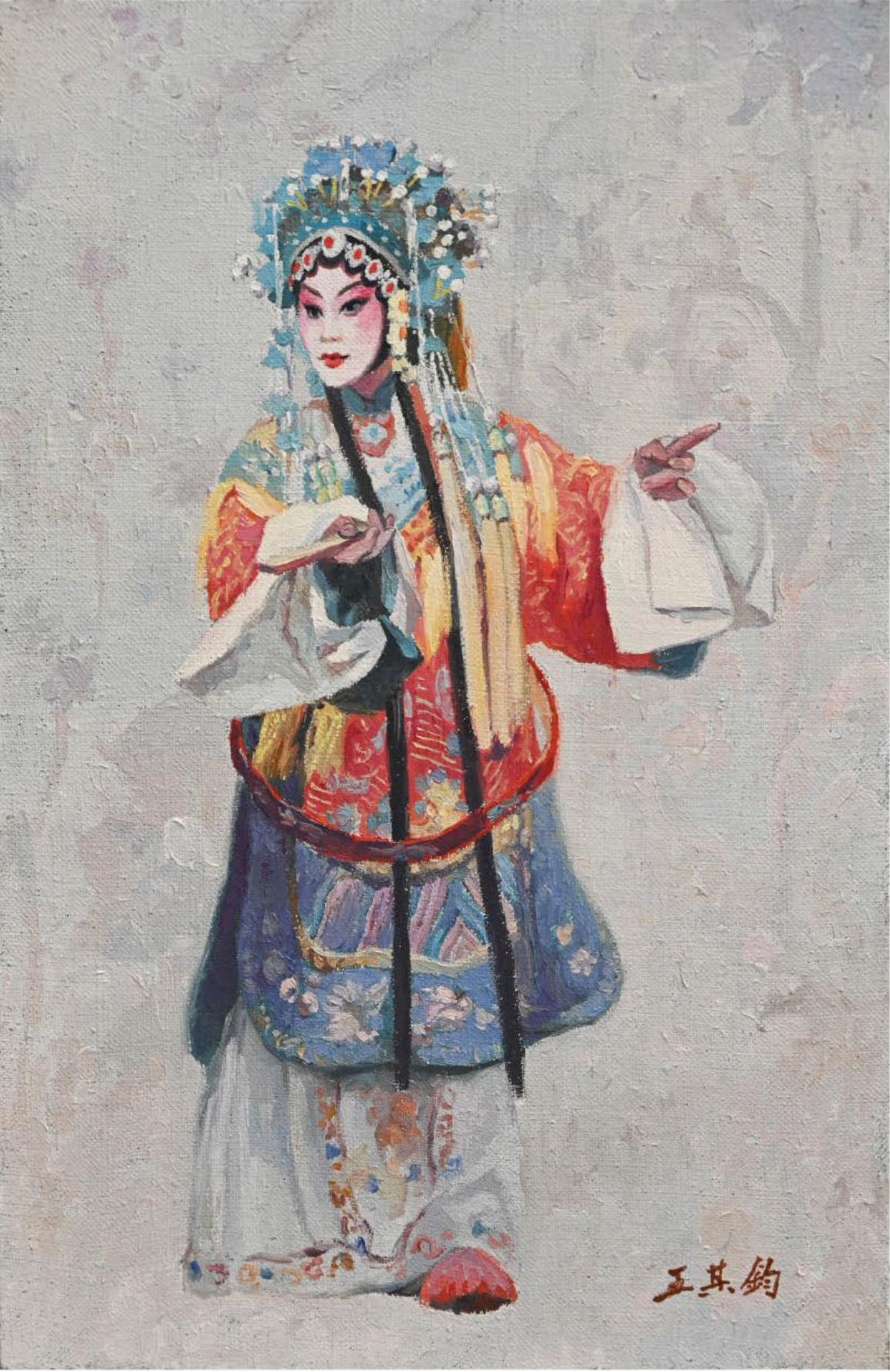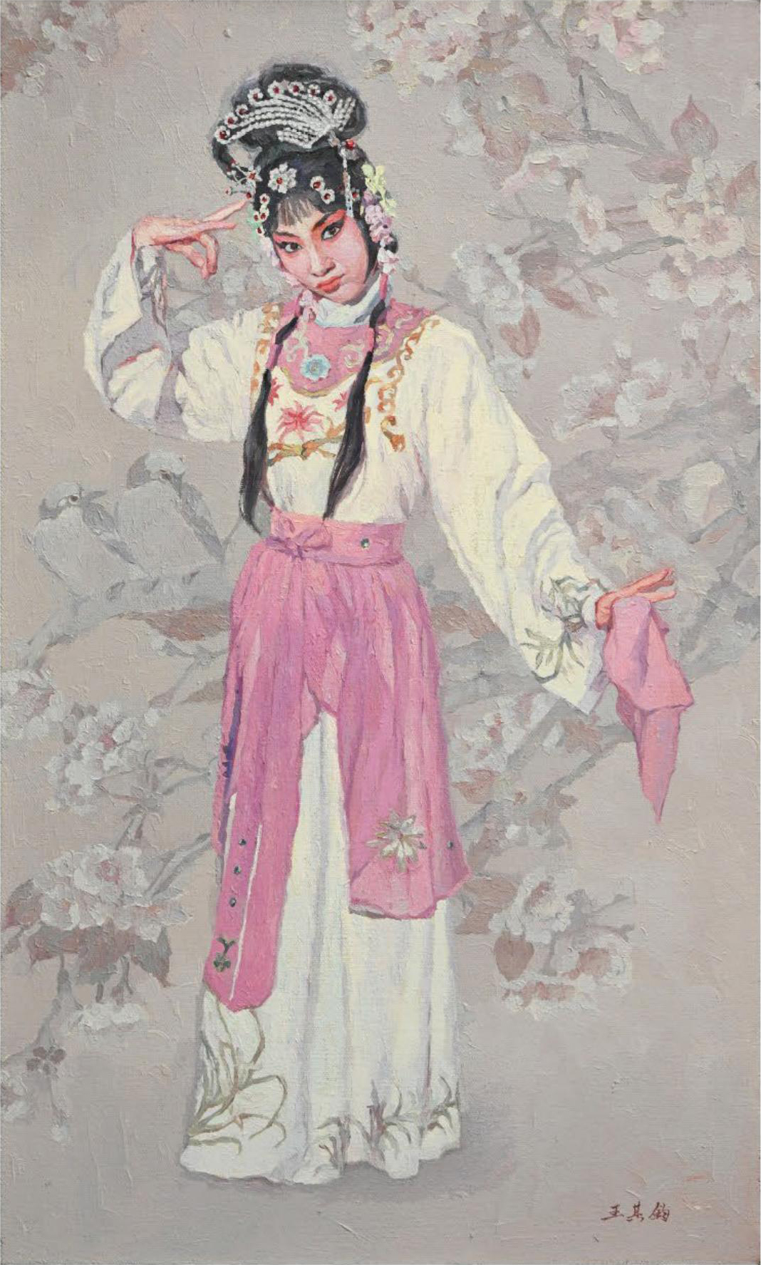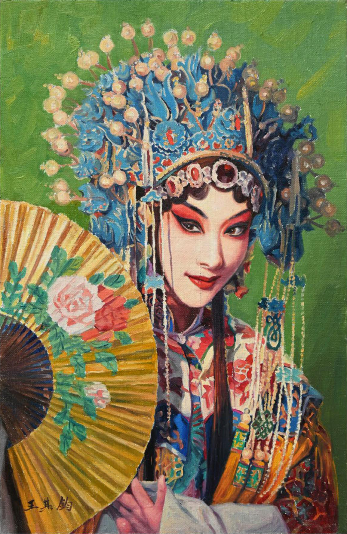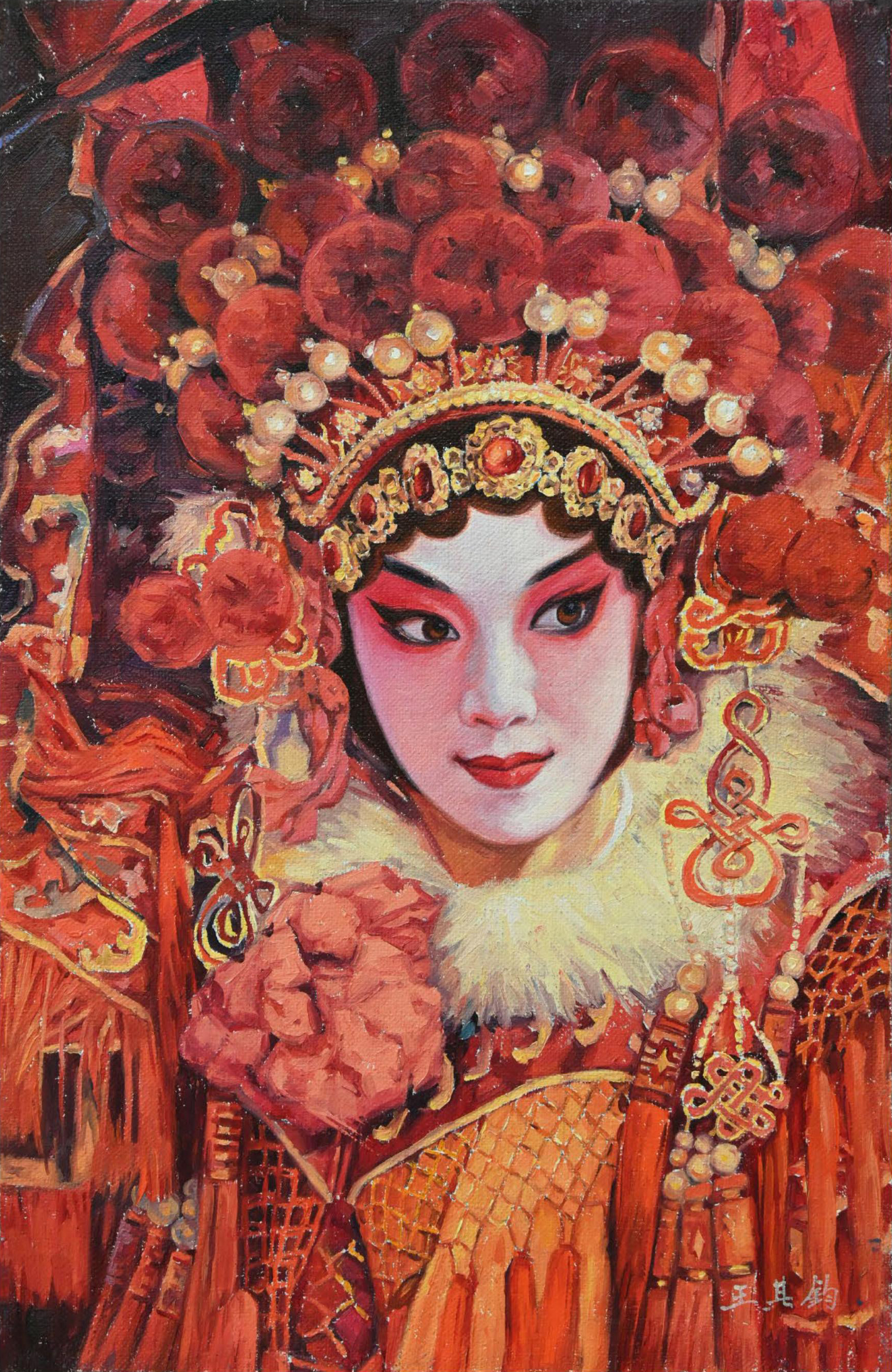 The graceful figure of a Peking Opera dan is immortalized in blended oil paints. Her magnificent opera costume takes center stage.