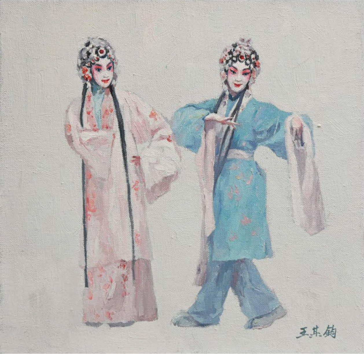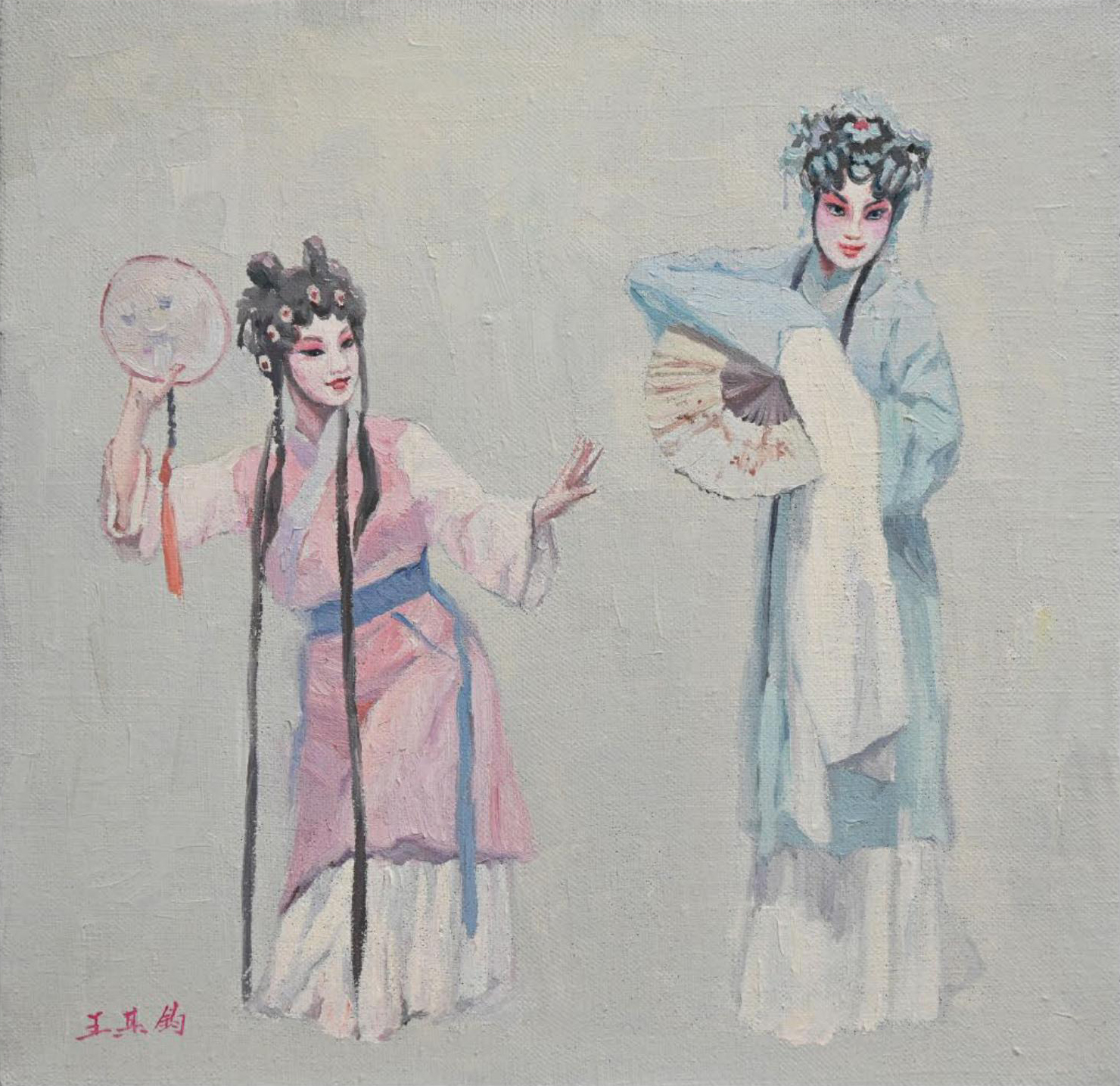 Powder-blue swirls, and beauty drifts into the frame. The instant the oil sets is the instant romance bends at the waist. Two fleeting silhouettes—pink and blue—shatter time across the canvas, blooming into the soft-edged spirit that only a Beijing-Opera huadan role (young and lively female role) can wear. The peach-pink on the left is the flush spring sunlight leaves on a cheek; cut from supple satin, it forms a quiet tableau—yet both arms refuse stillness, reaching right along an invisible beat, like willow tassels brushing water or butterfly wings scenting air, turning a static pose into a pulse that keeps moving the eye. The pale blue on the right is cloud trimmed under moonlight, rinsed in cool water tones. A hair ornament seems ready to tremble with each step, but the torso wheels suddenly, profile gazing out beyond the frame; brows and eyes hold more story than speech. Arms unfold like a crane’s first stretch, water-sleeves spilling star-rivers down the curves of her arms; in that relaxed arc lives a thousand turns of motion—just after a swirl of sleeves has ended, just before the next bright flourish begins.