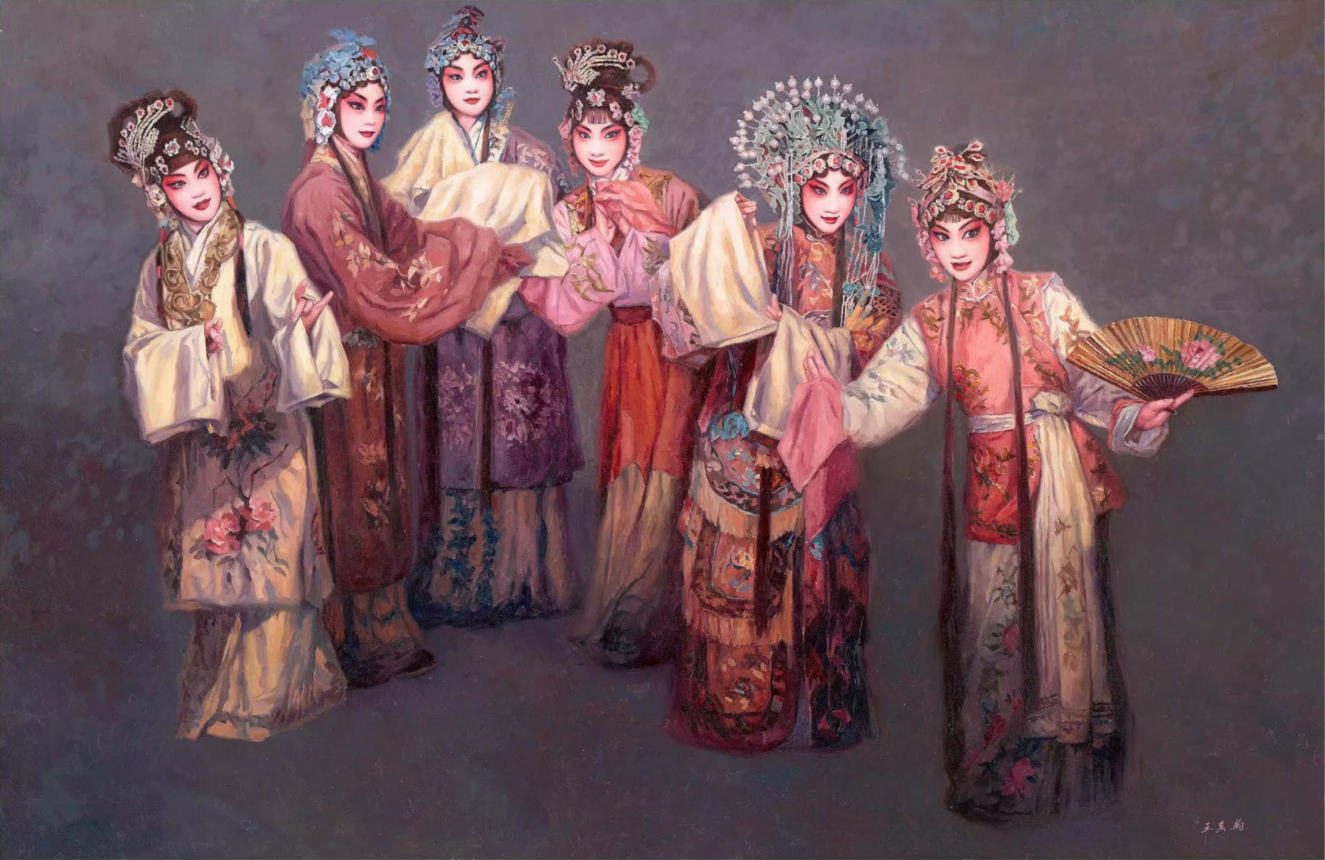 Centered on a group of full-length Beijing-Opera dan roles, the painting assembles a chorus of resplendent yet distinct figures. Each costume erupts in its own palette; each gesture bears a private music. One dan lifts a folded fan, the silk barely parted as if sheltering every unspoken longing; another lets water-sleeves slide through her fingers, the falling cloth turning into slow-moving cloud-scrolls; a third freezes her hand in an orchid-shape, the curving fingers fluent with delicate life. Their poses answer one another across the canvas—glances, tilts, echoes of sleeves—so the whole group seems to breathe as one, caught in a single hush of movement. Most arresting are the eyes: every dan looks straight out of the picture, meeting the viewer with a silent question that makes the painted stage feel suddenly intimate. A warm, diffuse light washes over silk, embroidery, and skin, softening textures and tempering colors until the entire scene glows like a lantern of rose-tinted ivory. In this hush of radiance, the quintessential grace and lingering perfume of Beijing-Opera are revealed in full.